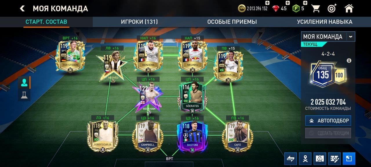 💰Золото: 2 013 396 152 📗Fifa-point: 5 🛑45 💪 Игроки : 131 ✔️Все привязки отсутствуют