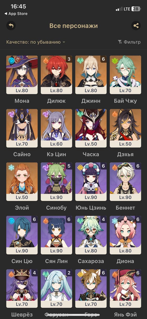 📈 Ранг: 60 🧍‍♀️ Персонажи: Дилюк, Ху Тао, Мона, Аяка, Е Лань, Чжун Ли, Тарталья, Ёимия, Тигнари, Ци Ци и другие ✨ Примогемы: 6150